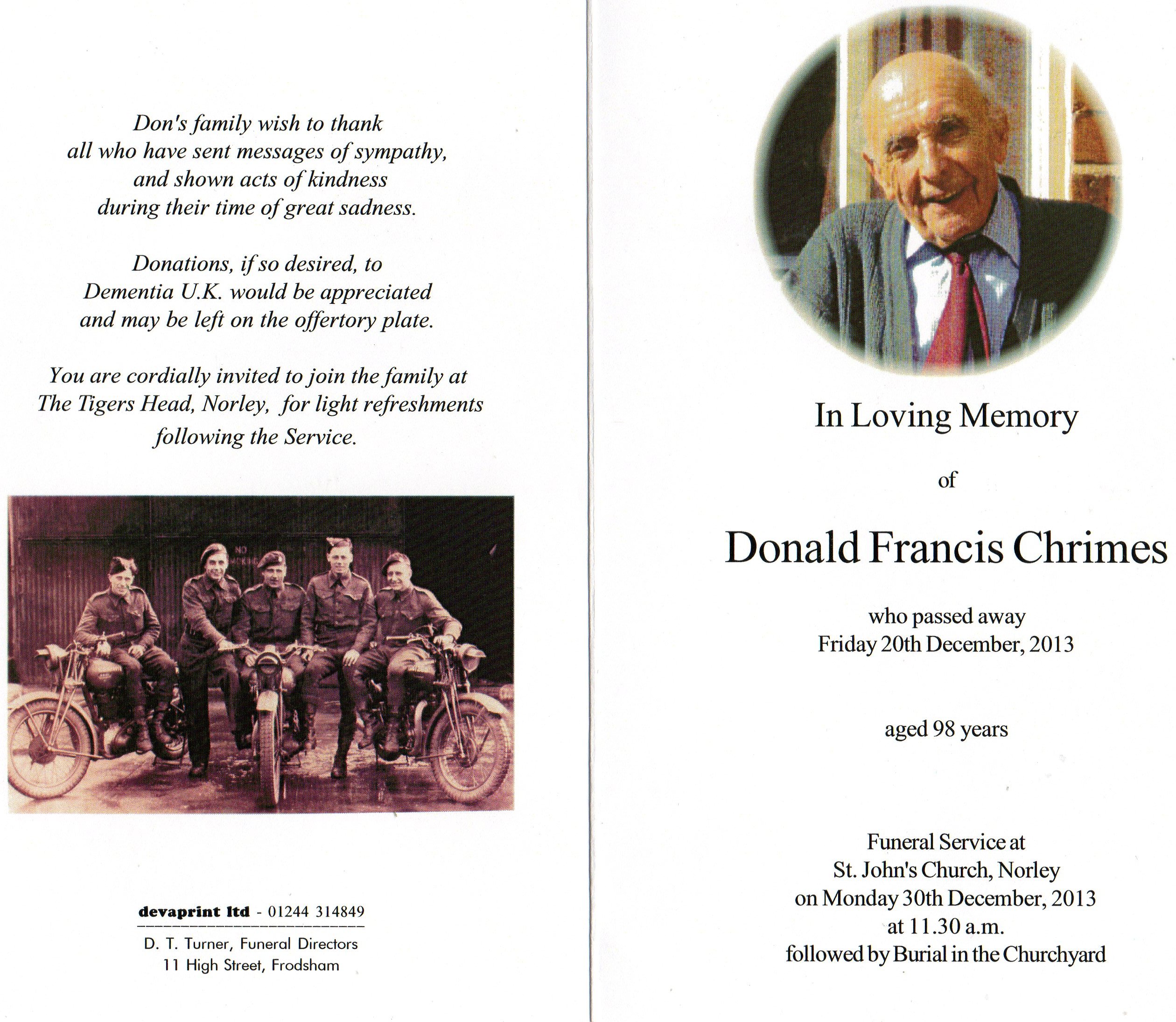 In 1921 Donald Francis was attending school 'Whole Time'. Donald Francis lived to be 98 years old. Follow this link to the Order of Service used at Donald Francis's funeral (opens in a New Window) |