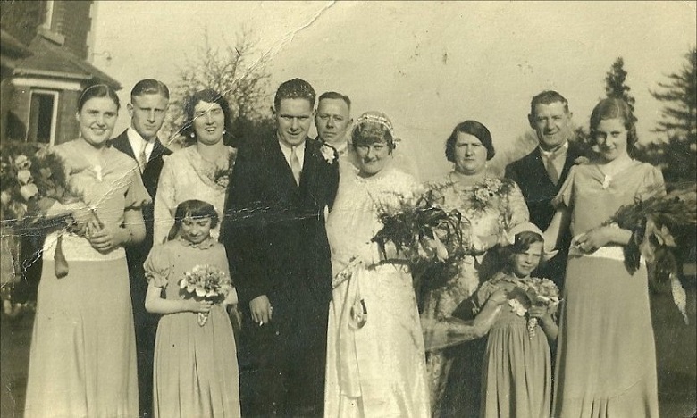 Groom: George Frederick ELLIS, Bride: Jennie Ellis née CHRIMES, then continuing to the right, Jennie W Chrimes née JOHNSON and John Arthur CHRIMES at the back, Barbara CHRIMES aged 7 and Josie CHRIMES aged 15 at the front