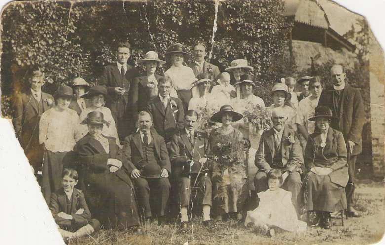 Seated, from the left: Sarah Jane Crimes née COOPER, James CRIMES, Tom CRIMES, Olive Crimes née GRIMES, Thomas CRIMES, Harriet Crimes née KING Behind Sarah Jane: groom's sisters Emily Large née CRIMES and Mary Ellen CRIMES Behind Thomas: groom's sister Annie Nancy CRIMES and sister-in-law Lilian Crimes née ROWLANDS in 1924