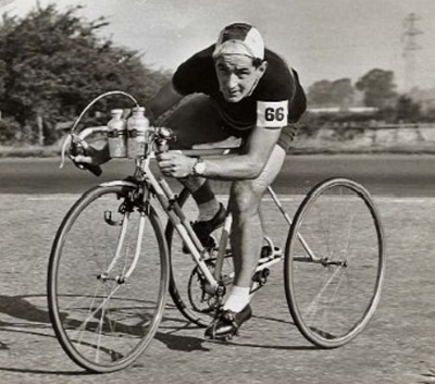 Probably two of the most talented record breakers we have had in our Association are Albert Crimes and John Arnold. In addition to their individual achievements they formed a unique partnership and established the following RRA [Road Records Association] records on Tandem Tricycle: 50 miles in 1hour 49 minutes 55 seconds; 100 miles in 3 hours 46 minutes 30 seconds; 257.75 miles in 12 hours; 466.25 miles in 24 hours and, 1000 miles in 2 days 13 hours 59 minutes. In 1954 Arnold would team up with Crimes to set an End-to-End record on the tandem tricycle which may perhaps never be beaten. Albert went on to set a new tricycle End to End Record in 1957, and in 1958, a 1000 miles tricycle record that still stands today.