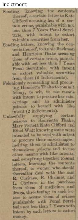 In 1899 Richard, Edward and Leonard Chrimes stood trial at the Old Bailey, London accused of blackmailing thousands of vulnerable women who were seeking to abort their unborn children. By the law of the time, advertising for sale products claimed to bring about an abortion was not illegal, but aborting or attempting to abort a child was an offence punishable by a prison term. The Chrimes brothers sought to exploit this legal contradiction.